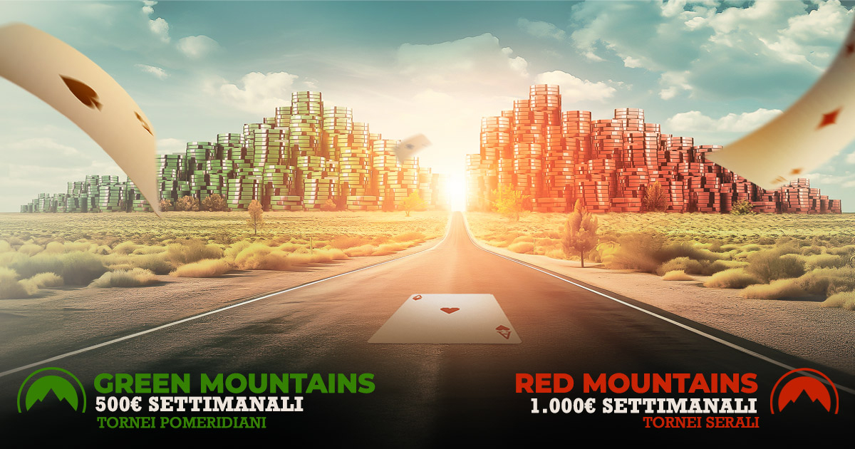 Partecipa alle classifiche Red & Green Mountains; ogni settimana 2 classifiche ti accompagneranno sui tavoli poker. Un montepremi da 1.500€ ti aspetta